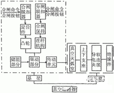 在進(jìn)行高壓戶內(nèi)外真空斷路器結(jié)構(gòu)分析時(shí),不管何種結(jié)構(gòu)方式的斷路器均可將其操作系統(tǒng)分為操控、動(dòng)力和傳動(dòng)三部分。圖1是高壓戶內(nèi)外真空斷路器結(jié)構(gòu)原理示意圖。